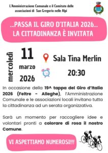 In occasione della 19^ tappa del Giro d’Italia 2026 (Feltre - Alleghe), l’Amministrazione Comunale e le associazioni locali invitano tutta la cittadinanza ad un serata organizzativa che si terrà