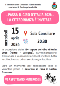 In occasione della 19^ tappa del Giro d’Italia 2026 (Feltre - Alleghe), l’Amministrazione Comunale e il comitato delle associazioni locali invitano tutta la cittadinanza ad un serata organizzativa che si terrà