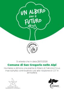 Mercoledì 28 gennaio 2026, la comandante del Reparto Carabinieri Biodiversità di Belluno Elisabetta Tropea ha consegnato al Sindaco del Comune di San Gregorio nelle Alpi Nicola Vieceli, l'albero di Giovanni Falcone, simbolo della lotta per la legalità e della protezione dell’ambiente.