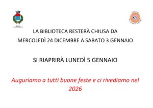 LA BIBLIOTECA RESTERÀ CHIUSA DA MERCOLEDÌ 24 DICEMBRE A SABATO 3 GENNAIO