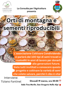 La Consulta per l'Agricoltura del Comune di San Gregorio nelle Alpi presenta la serata Orti di montagna e sementi riproducibili.